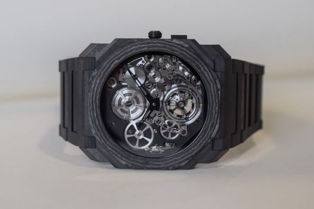 Ebben az évben a Finissimo a superleggero (szuperkönnyű) kifejezésre rímel, és még könnyebb, mint volt. A márka a CTP-t (carbon thin-ply) azaz vékony rétegű karbont használt titán helyett a 42 mm-es tokhoz. Az Octo Finissimo TB Carbon így mindössze 48 grammot nyom. A high-tech anyag emellett igazán eredeti megjelenést ad az órának a csíkos mintázattal. A zafír kristály használata a hátlapon viszont azt jelenti, hogy egy hajszálnyival vastagabb, mint a titán modell, a 3,95 mm helyett 5,38 mm lett.